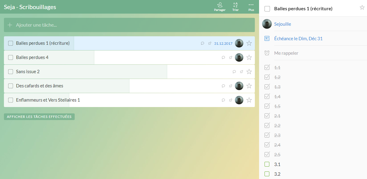 Cet outil me sert à lister tous les projets sur lesquels je suis en train de travailler et de voir l’avancement par rapport aux chapitres terminés / à faire. Par exemple, pour le BP 1 qui est déplié sur l’image, j’ai saisi 35 sous-tâches pour les 35 chapitres. Ce qui fait que quand je coche un chapitre, la barre de progression avance. C’est franchement pratique pour avoir une vision d’ensemble de tout ce petit monde.